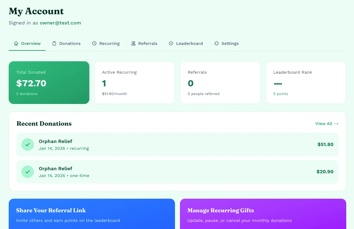 Complete Donation History Every gift you've made, organized chronologically with full details. See which campaigns you've supported, when you donated, and how your contributions have added up over time.