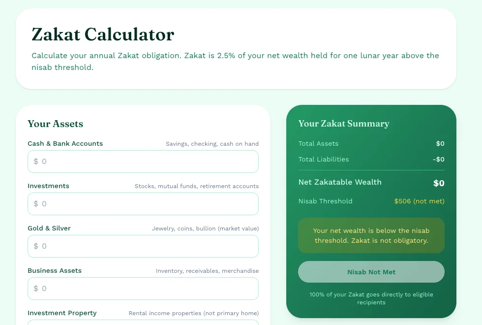 Zakat Calculator Enter your assets—savings, gold, silver, investments, business goods—and get your precise zakat obligation. The calculator handles nisab thresholds automatically and deducts liabilities to give you an accurate figure.
